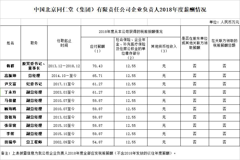 中國北京同仁堂(集團)有限責任公司企業(yè)負責人2018年度薪酬情況