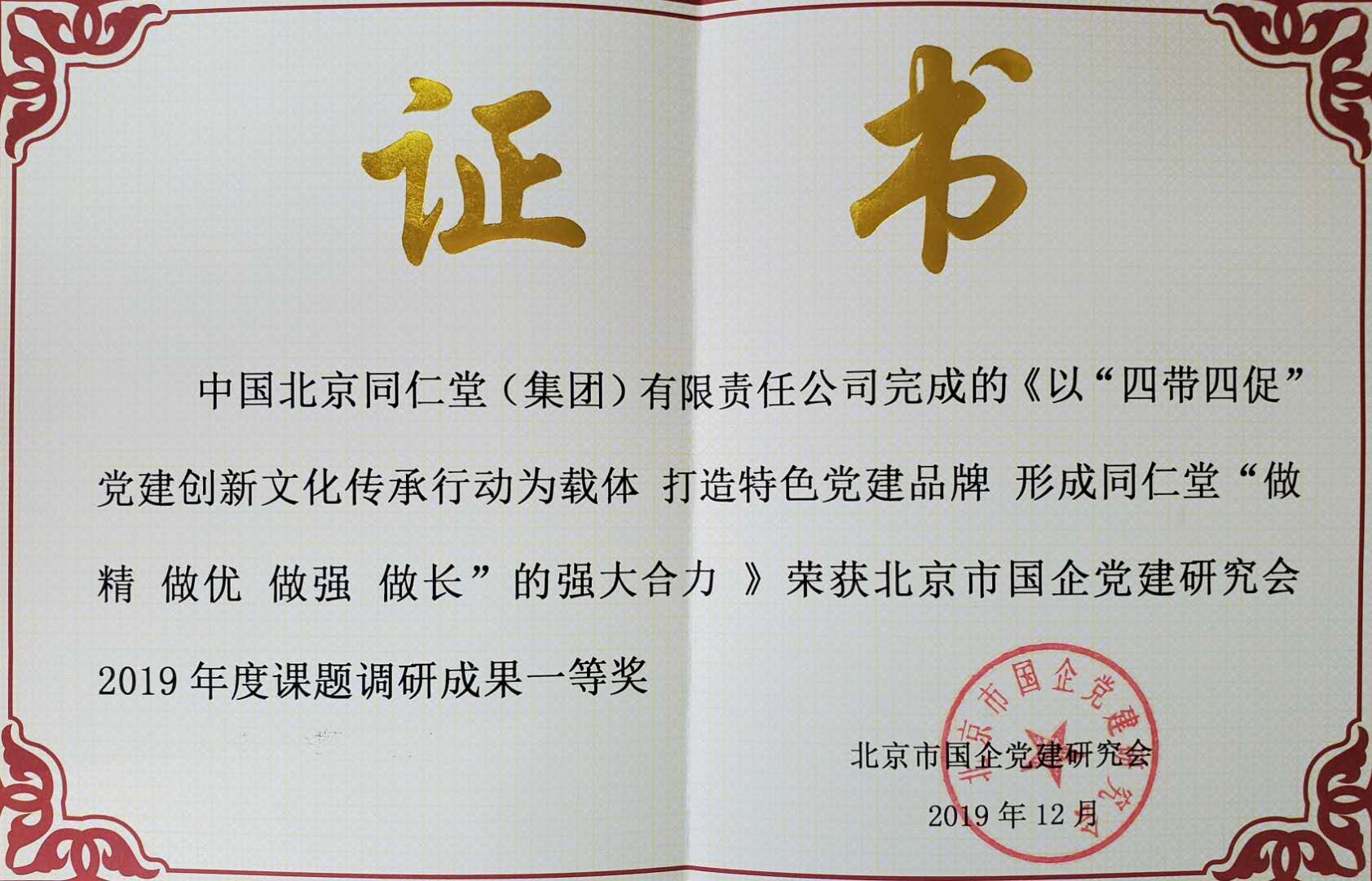 近日,中國北京同仁堂(集團(tuán))有限責(zé)任公司完成的《以“四帶四促”黨建創(chuàng)新文化傳承行動為載體 打造特色黨建品牌 形成同仁堂“做精 做優(yōu) 做強(qiáng) 做長”的強(qiáng)大合力》榮獲北京市國企黨建研究會2019年度課題調(diào)研成果一等獎。