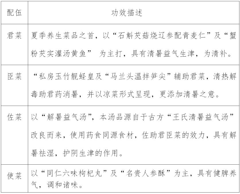 基于夏季特點,藥膳應(yīng)以“清補(bǔ)祛濕,滋陰生津”為主,據(jù)此形成了同仁堂粹和藥膳的夏季養(yǎng)生菜單。菜單整體按照中藥配伍含義,分君、臣、佐、使。“君菜”為夏季養(yǎng)生菜單的首要,起清補(bǔ)的作用;“臣菜”的含義為輔助君菜,具有協(xié)同作用;“佐菜”在本菜單主要為增助君、臣菜的作用,佐以解暑祛濕、養(yǎng)陰生津的作用;“使菜”為引經(jīng)藥或調(diào)和整體菜單的效果,具體見下表:
