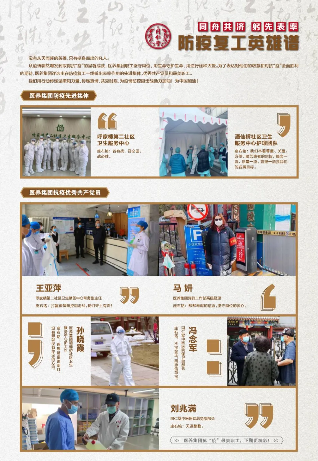 在同仁堂醫(yī)養(yǎng)集團(tuán)最大的會(huì)議室——第一會(huì)議室外,有一塊別具一格的墻面:上面圖文并茂,歷歷如繪。這就是同仁堂醫(yī)養(yǎng)集團(tuán)“社會(huì)主義核心價(jià)值觀黨建文化墻”。這5幅文化墻展板如同5位“講解員”,從疫情防控瞬間、一線黨員先鋒、基層最美職工、第三次黨代會(huì)精選、同仁堂醫(yī)養(yǎng)集團(tuán)成立幾個(gè)方面,將同仁堂醫(yī)養(yǎng)集團(tuán)踐行社會(huì)主義核心價(jià)值觀、傳遞正能量的故事娓娓道來(lái)。其中最動(dòng)人心弦的就是在新發(fā)地聚集性疫情中,同仁堂醫(yī)養(yǎng)集團(tuán)下屬社區(qū)醫(yī)院的醫(yī)療工作者們?cè)诜酪咭痪€發(fā)生的感人故事。
