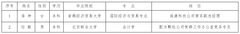 根據(jù)《北京同仁堂中藥配方顆粒投資有限公司招聘工作方案》,通過網(wǎng)上發(fā)布公告、簡(jiǎn)歷篩選、資格審查、面試、筆試、人事檔案核查等招聘環(huán)節(jié),經(jīng)配方顆粒公司黨支部會(huì)議審議通過,擬招聘以下人員,現(xiàn)公示如下: