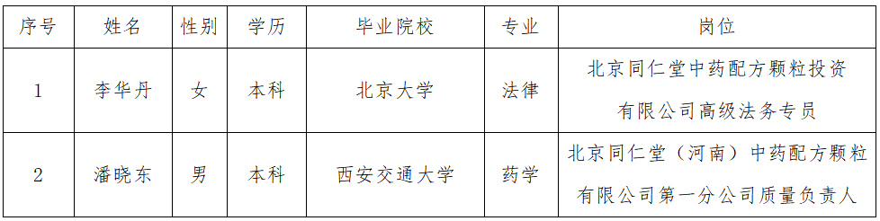 根據(jù)《北京同仁堂中藥配方顆粒投資有限公司招聘工作方案》,通過(guò)網(wǎng)上發(fā)布公告、簡(jiǎn)歷篩選、資格審查、面試、筆試、人事檔案核查等招聘環(huán)節(jié),經(jīng)配方顆粒公司黨支部會(huì)議審議通過(guò),擬招聘以下人員,現(xiàn)公示如下: