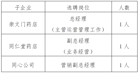 為進(jìn)一步拓寬選人視野,加大競(jìng)爭(zhēng)性選拔力度,完善市場(chǎng)化選人用人機(jī)制,同仁堂集團(tuán)現(xiàn)面向社會(huì)開(kāi)展子企業(yè)北京同仁堂崇文門(mén)藥店有限責(zé)任公司(以下簡(jiǎn)稱(chēng)崇文門(mén)藥店)、北京同仁堂商業(yè)投資集團(tuán)有限公司同仁堂藥店(以下簡(jiǎn)稱(chēng)同仁堂藥店)和北京同仁堂商業(yè)投資集團(tuán)有限公司安宮牛黃丸專(zhuān)銷(xiāo)公司(以下簡(jiǎn)稱(chēng)同心公司)經(jīng)營(yíng)層成員市場(chǎng)化選聘工作,現(xiàn)將有關(guān)事項(xiàng)公告如下: